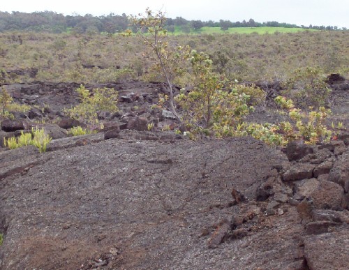 Some plant life has returned. Red lehua, unique to the region,