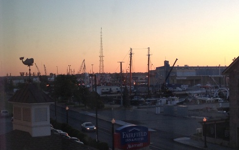 We lucked out on the hotel. Fortunately, the DWM had the forethought to reserve a block of rooms across the street from the state pier, so we could park the car for the weekend and walk just about everywhere we wanted to go. Great! We’re right across the street from the pier… with a handsome old stone building precisely blocking our view of the ship … oh well.