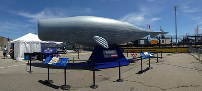 A bit more time touring exhibits on the pier, Spouter, the inflatable whale, murals and various demonstration booths in the exhibition hall, and a few too many souvenirs? (Well, never enough, really.) On the pier, visitors could climb aboard a whaling boat and imagine their own Nantucket sleigh ride — imagine being key, as this boat was on a trailer. However, the rest of the ship’a boats were, indeed, in the water waiting to take imaginative souls with willing backs out on the water. The rides were free as long as you contributed muscle to the forward motion. Alas, timing didn’t work for us, but plenty of other folks took to the oars. |