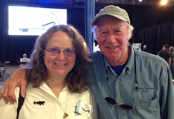 The keynote for the luncheon was a chat with Kip Files, master of the Charles W. Morgan. Clearly the folks at Mystic knew what they were doing when they hired him. His talk was essentially an off-the-cuff storytelling of the elements that came together to make him a sailor: beginning with learning to row as a small child, the accompanying frustration that comes of being stuck downwind from where he wanted to go, and the startling realization that “Mothers can row!” (clearly struck a chord with this rowboat-owning mother). From there, he described the marvel finding whale teeth in a tumbled-down woodshed, moving from lake to ocean, and sailing bigger and bigger boats, including Victory Chimes and Elissa until he became one of a small handful of people who might be considered qualified to head a vessel whose like has passed from living knowledge. There simply are no living men who have sailed wooden whaling ships before him, and a ship dressed for museum display isn’t necessarily rigged properly for working sail. “You can read the manual for a Mack truck,” he said, “but that doesn’t mean you know how to drive one.” Fortunately, Captain Files had the wit to make it all work. Surprisingly, he said, the Morgan handles better than anybody expected her to. Perhaps she’s just happy to be at sea again, but the tubby old bark moved faster and maneuvered more spritely than her age and lines belie. On the other hand, it makes sense when you stop to think about it. This lucky old ship sailed the “wrong way” around Cape Horn a dozen times, often with half her crew starting the voyage as greenhands. She’d have to be well designed and well built to come back alive so many times, and 37 voyages over the course of an 80-year career was probably ample time to work the bugs out of her design. Clearly, Captain Files respects the Morgan’s working ability. He was thoroughly convinced that he could have sailed her through the hurricane gate and right up the dock in New Bedford just as she would have done a hundred years ago, but the insurance carrier wasn’t so sure … hmm, better not to press that luck. At least we finally got a respectable picture of him before it was time to head home.