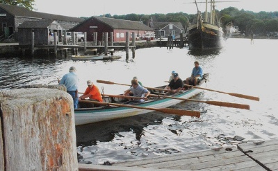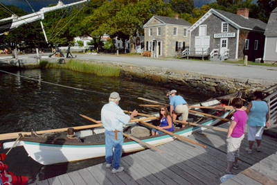 In conjunction with the Morgan restoration, the seaport has ten reproduction whaleboats, which accompanied her on her summer voyage. During some of her port calls, visitors had the opportunity to take to the oars and go for short trips around various harbors. A series of chance conversations brought about a similar opportunity for us after the seaport closed for the day. Jim Mortimer, Liz Kading, and their crew from the seaport staff met us at the whaleboat dock and headed boats out for us to take our turns at the oars.