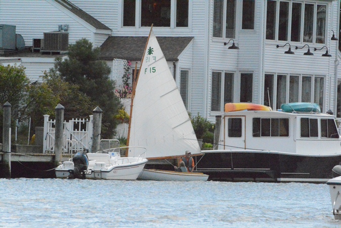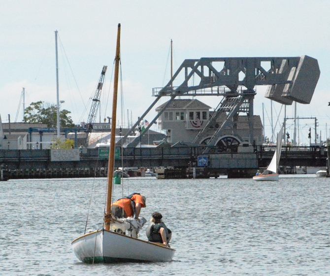| The course itself was a different story entirely. The starting line was marked by the committee boat (headed by seaport staffer Chris Williams) and a temporary buoy, and the windward mark was one of the can buoys that marks the shipping channel. Here’s where it gets tricky: our gorgeous Saturday in high summer meant there was plenty of boat traffic on the river, including one big motor boat that seemed intent on having a very close view of the pretty sailboats, especially as they were trying to maneuver around the windward mark. The wind and tide were both headed downstream, and catboats–despite their many virtues–don’t point terribly high on the wind, so sailing to windward requires a lot of tacking. It’s a river, which means it has a current, and this one is narrow with one side substantially shallower than the other. … all of which meant going down river was easy, but getting back was a beast! |