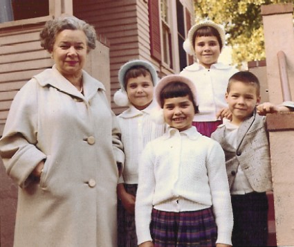 Left, standing directly next to Mary is Lorraine Crosby. Closest to camera in center is Stephanie Crosby. The girl on the highest step in the center is Evelyn Crosby. The boy on the right is Karl Crosby, twin of Lorraine. Birth order: Evelyn, Stephanie, Lorraine, Karl.