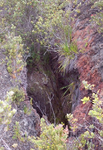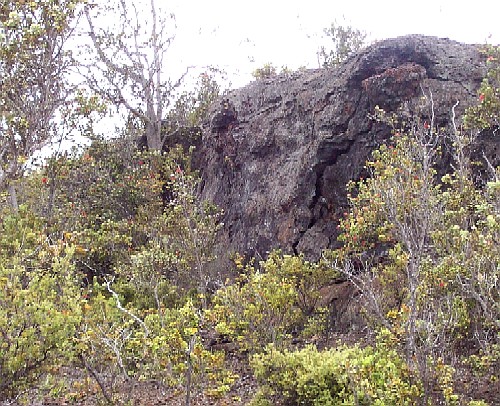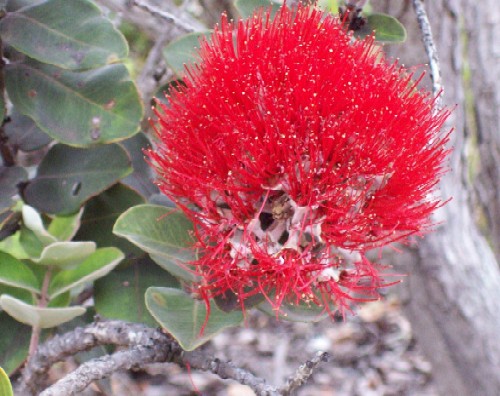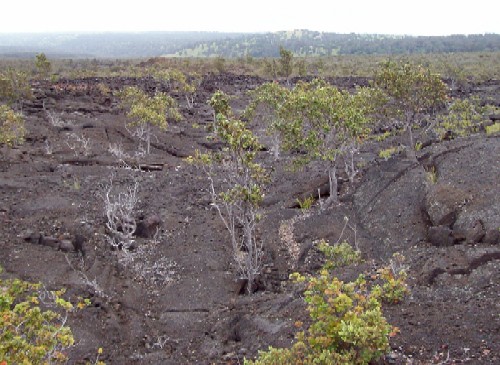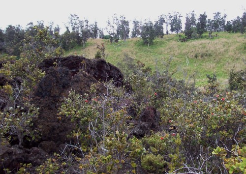 Some plant life has returned. Red lehua, unique to the region,