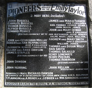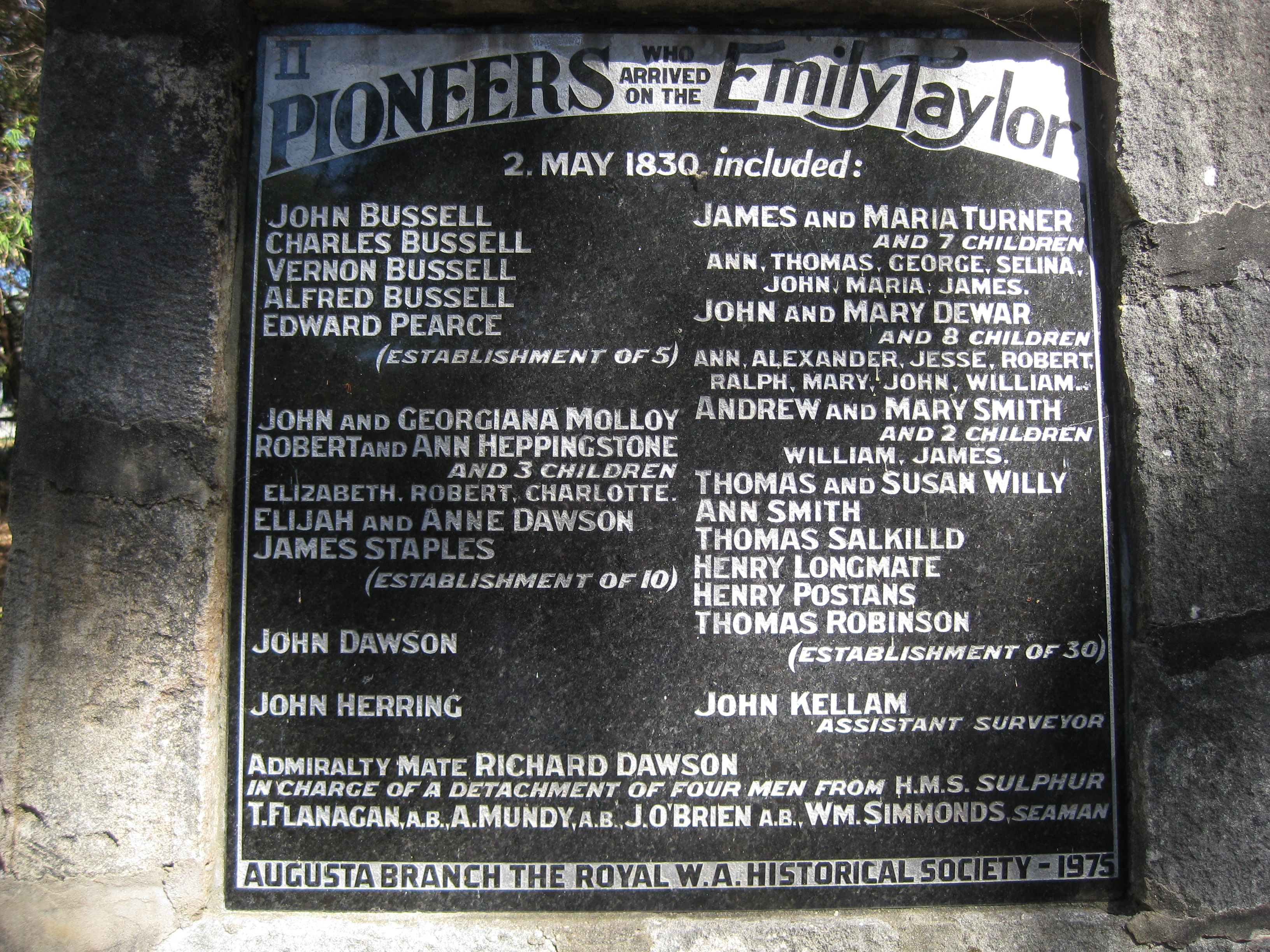 Among them, Robert Heppingstone Sr. had signed on in the employ of John Molloy, his former army captain, following the promise of free land granted to immigrants who brought money, goods, and laborers to tame the wilderness. Robert brought with him his wife, their baby daughter, and his two children from a previous marriage. Arriving at the Swan River Colony (now Fremantle), they met with news that choice lands in the colony were all taken, but there would be more if they went farther south. So they boarded another, smaller ship, the Emily Taylor, which on May 2, 1830, landed them on the beach at what was to become the town of Augusta, at the mouth of the Blackwood River.
