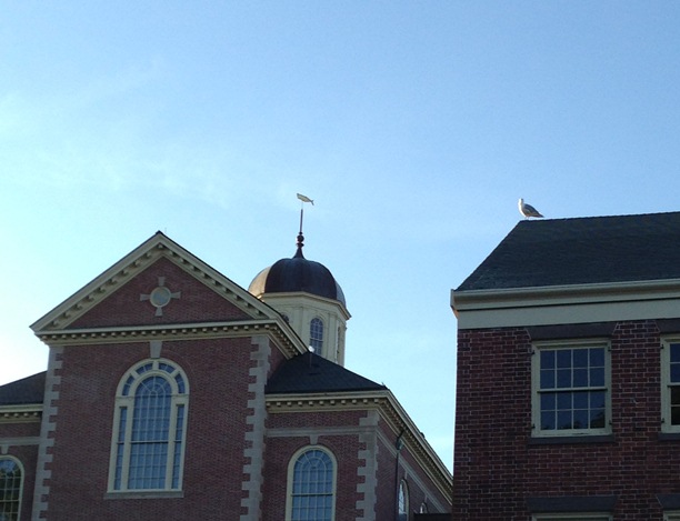 There are benches and a little patch of green designated as “Coast Guard Park” on the waterfront, and we thought that might be a good place to end the day. After dinner, we strolled around town in search of take-out coffee, which doesn’t seem like an outrageous idea, right? The first place we tried had coffee, but no take-out — a pizza place that doesn’t do take out, go figure! We strolled farther up the hill and paused to evaluate the gull campaigning for its own berth as a weathervane adjacent to the whaling museum. (I’d vote for it.)