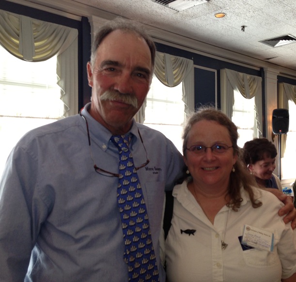 The keynote for the luncheon was a chat with Kip Files, master of the Charles W. Morgan. Clearly the folks at Mystic knew what they were doing when they hired him. His talk was essentially an off-the-cuff storytelling of the elements that came together to make him a sailor: beginning with learning to row as a small child, the accompanying frustration that comes of being stuck downwind from where he wanted to go, and the startling realization that “Mothers can row!” (clearly struck a chord with this rowboat-owning mother). From there, he described the marvel finding whale teeth in a tumbled-down woodshed, moving from lake to ocean, and sailing bigger and bigger boats, including Victory Chimes and Elissa until he became one of a small handful of people who might be considered qualified to head a vessel whose like has passed from living knowledge. There simply are no living men who have sailed wooden whaling ships before him, and a ship dressed for museum display isn’t necessarily rigged properly for working sail. “You can read the manual for a Mack truck,” he said, “but that doesn’t mean you know how to drive one.” Fortunately, Captain Files had the wit to make it all work. Surprisingly, he said, the Morgan handles better than anybody expected her to. Perhaps she’s just happy to be at sea again, but the tubby old bark moved faster and maneuvered more spritely than her age and lines belie. On the other hand, it makes sense when you stop to think about it. This lucky old ship sailed the “wrong way” around Cape Horn a dozen times, often with half her crew starting the voyage as greenhands. She’d have to be well designed and well built to come back alive so many times, and 37 voyages over the course of an 80-year career was probably ample time to work the bugs out of her design. Clearly, Captain Files respects the Morgan’s working ability. He was thoroughly convinced that he could have sailed her through the hurricane gate and right up the dock in New Bedford just as she would have done a hundred years ago, but the insurance carrier wasn’t so sure … hmm, better not to press that luck. At least we finally got a respectable picture of him before it was time to head home.