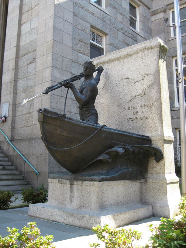 A few blocks farther up the hill is the New Bedford Public Library where Bela Lyon Pratt’s memorial statue of a whaleman has stood poised with his harpoon in hand since 1912. It was bigger than I expected, and ever so reminiscent of our own Nelson Haley who stood likewise in the bow of a fragile boat aiming for leviathan.