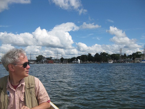 | The course itself was a different story entirely. The starting line was marked by the committee boat (headed by seaport staffer Chris Williams) and a temporary buoy, and the windward mark was one of the can buoys that marks the shipping channel. Here’s where it gets tricky: our gorgeous Saturday in high summer meant there was plenty of boat traffic on the river, including one big motor boat that seemed intent on having a very close view of the pretty sailboats, especially as they were trying to maneuver around the windward mark. The wind and tide were both headed downstream, and catboats–despite their many virtues–don’t point terribly high on the wind, so sailing to windward requires a lot of tacking. It’s a river, which means it has a current, and this one is narrow with one side substantially shallower than the other. … all of which meant going down river was easy, but getting back was a beast! |