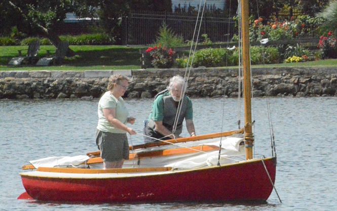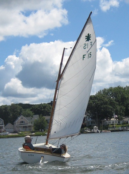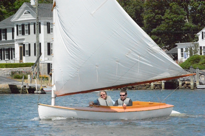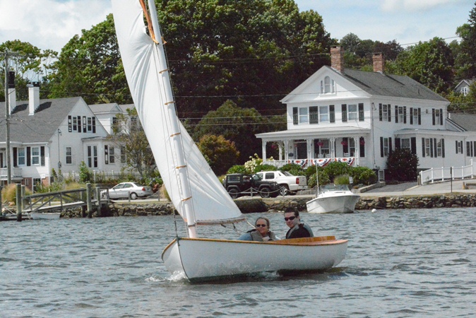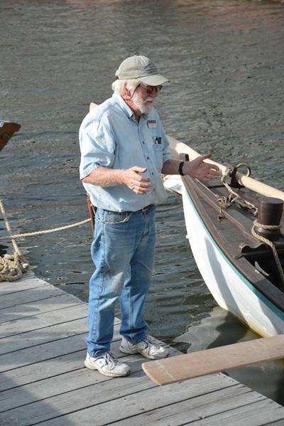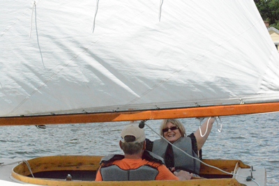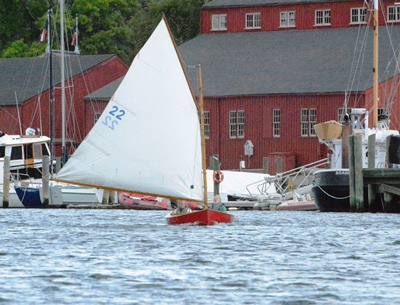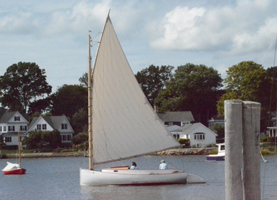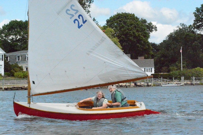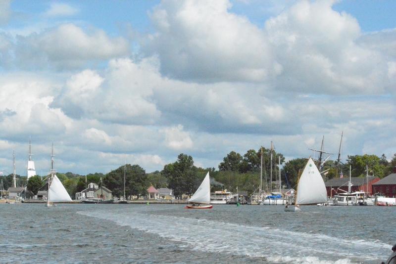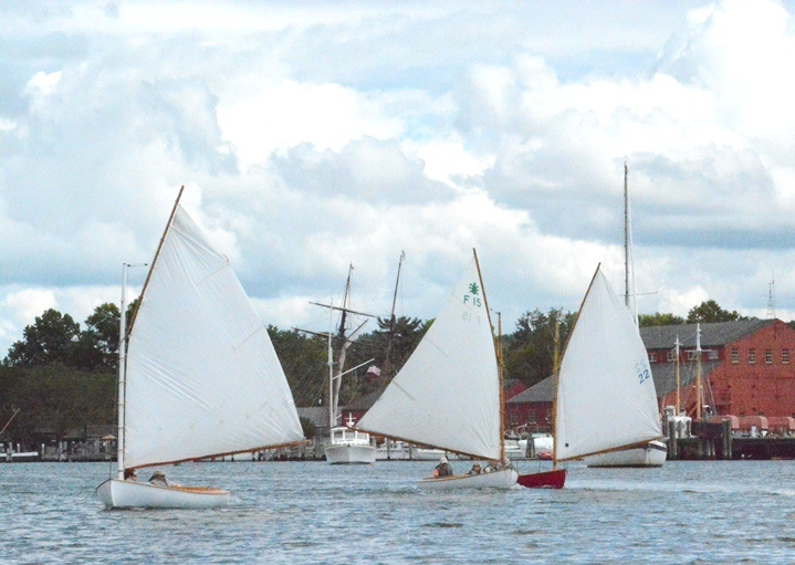 Alas, for various reasons, neither of the primary contenders from the previous challenge could make it to Mystic, so the field was wide open. Our challengers comprised three teams: Roger and Anne, Mike and Ellen, and Louise and Owen, all in fairly evenly matched catboats (except for one whose gaff peak wasn’t properly secured, but that wasn’t the boat crew’s fault).