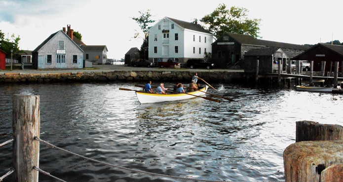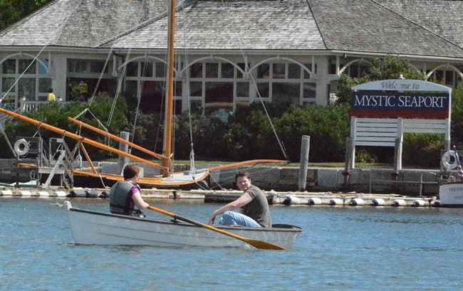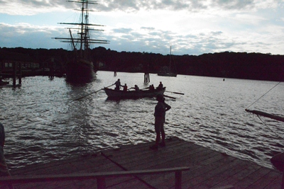 In conjunction with the Morgan restoration, the seaport has ten reproduction whaleboats, which accompanied her on her summer voyage. During some of her port calls, visitors had the opportunity to take to the oars and go for short trips around various harbors. A series of chance conversations brought about a similar opportunity for us after the seaport closed for the day. Jim Mortimer, Liz Kading, and their crew from the seaport staff met us at the whaleboat dock and headed boats out for us to take our turns at the oars.
