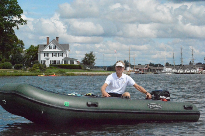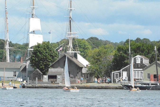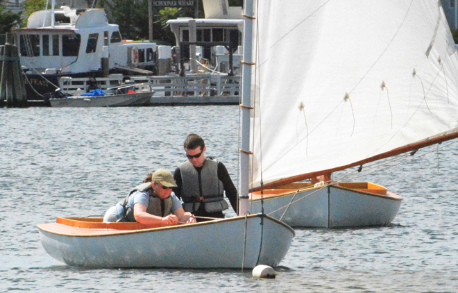 The seaport has a fleet of rental boats in various shapes and sizes. A few folks opted for rowboats, from which they could watch the “race” (and I use the term very loosely). A few more hopped aboard Breck Marshall, a 20-foot catboat that the seaport uses to take folks out for sailboat rides with a professional sailor at the helm. And our official photographer snagged a ride in the committee boat. In all, nearly everyone got out on the water in one craft or other. |